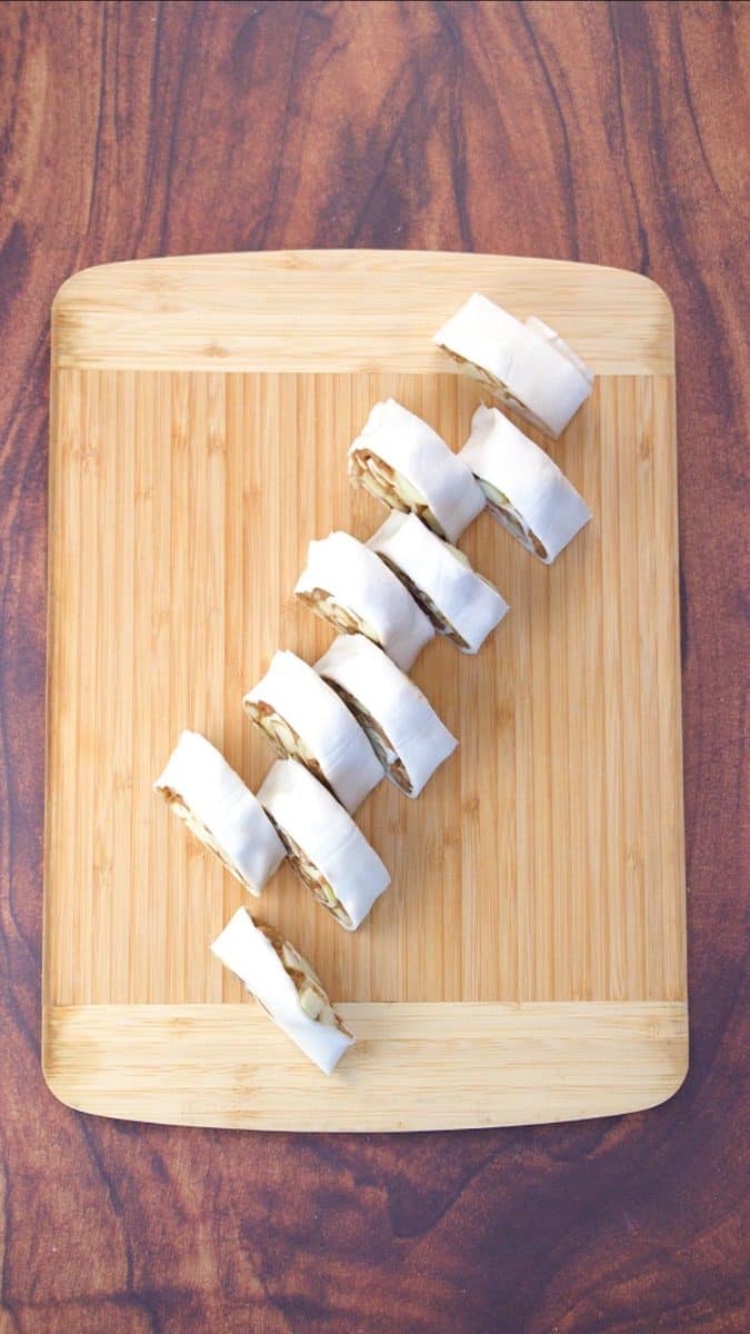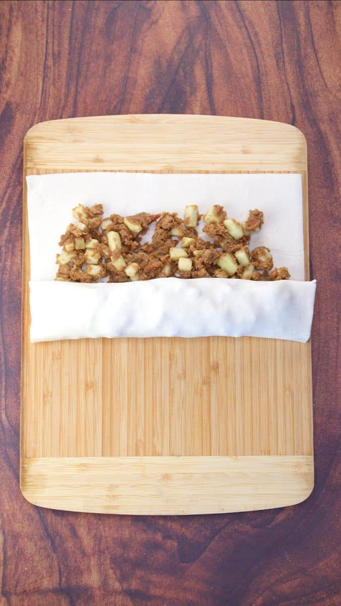 Roll & assemble: On a floured surface, roll pastry to about 15ร10โณ. Lightly moisten edges with water. Spread filling in the center, leaving a 1โณ border. Roll like a jelly roll and slice into 12โ14 oneโinch slices.