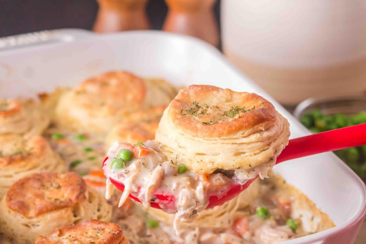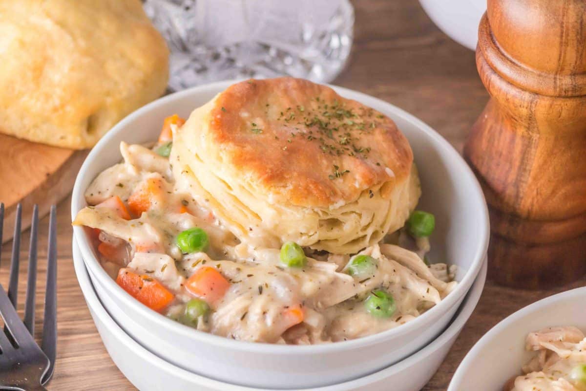 To reheat, warm the chicken mixture in a saucepan over low heat, stirring occasionally. Heat the biscuits in a 350ยฐF oven for 5-7 minutes to crisp them back up. You can also reheat individual portions in the microwave for 1-2 minutes.