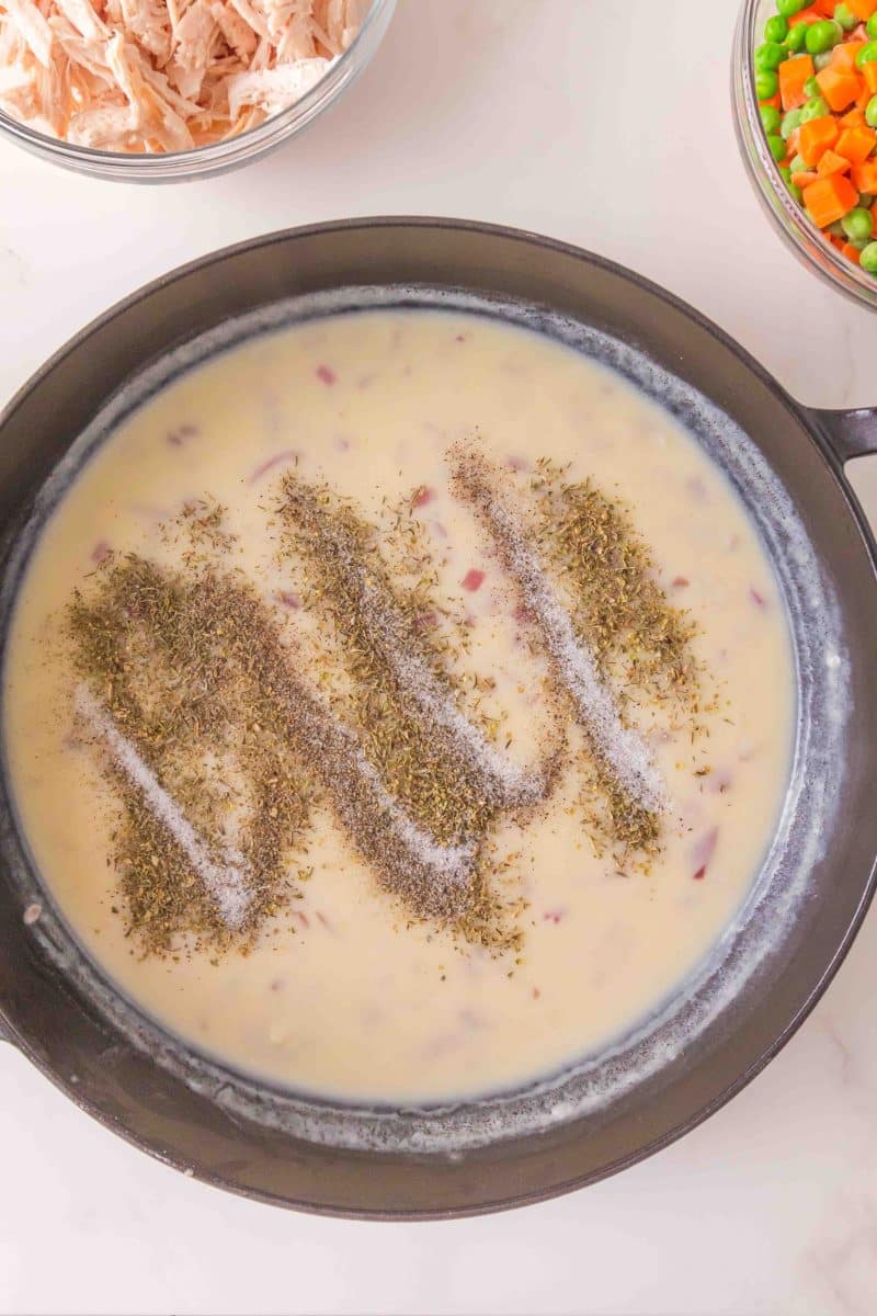 Slowly pour in the chicken broth and milk while stirring constantly. This keeps your sauce smooth without lumps. Add all your seasonings โ salt, pepper, Italian seasoning, and thyme. Keep stirring and let it simmer for 2-3 minutes until it thickens up nicely.