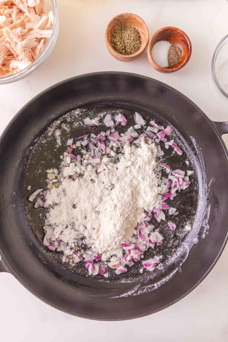 Add your diced onions and cook until theyโre soft and see-through, about 4-5 minutes. Sprinkle the flour over the onions and mix it in well. This step is important because it helps thicken your sauce.