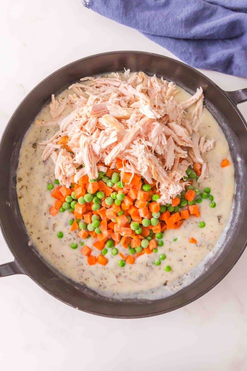 Stir in your frozen vegetables and shredded chicken. Let everything simmer together for 4-5 minutes so the flavors can blend. Pour this mixture into your prepared baking dish and spread it out evenly.