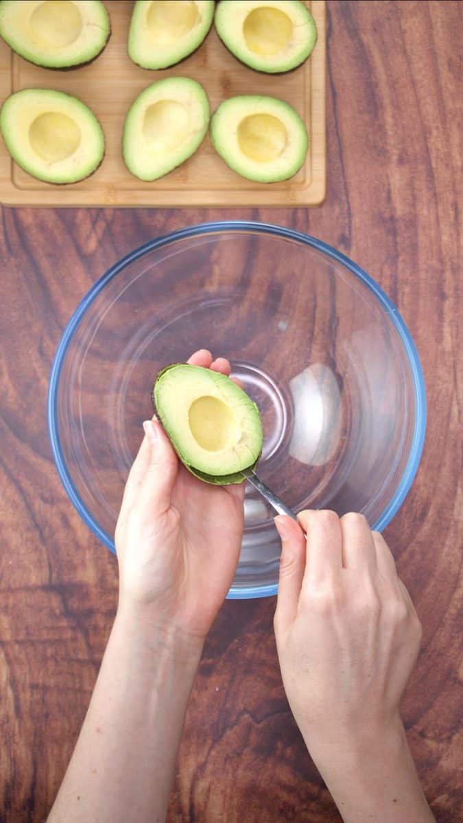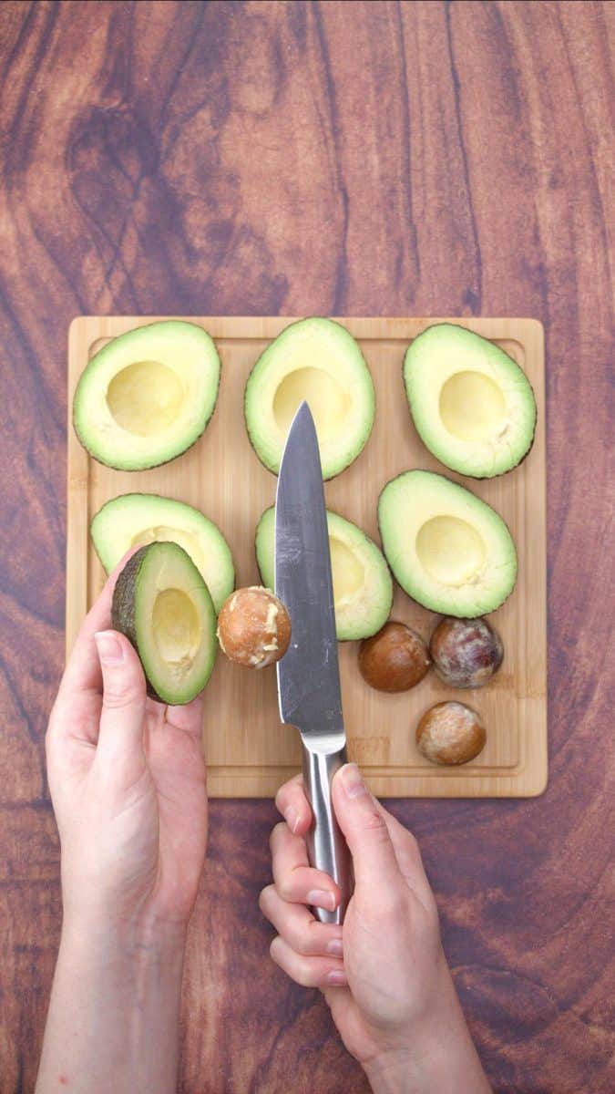 Here’s the easiest way to get perfect avocado chunks every time. First, slice the avocado in half lengthwise around the seed. Twist the two halves apart. To remove the seed, carefully tap it with the blade of your knife so the knife gets stuck in the seed, then twist and lift it out. Now for the flesh – take a large spoon and scoop it out in one piece by running the spoon between the flesh and the skin. This method keeps your avocado in nice big pieces that are perfect for our chunky guacamole recipe!