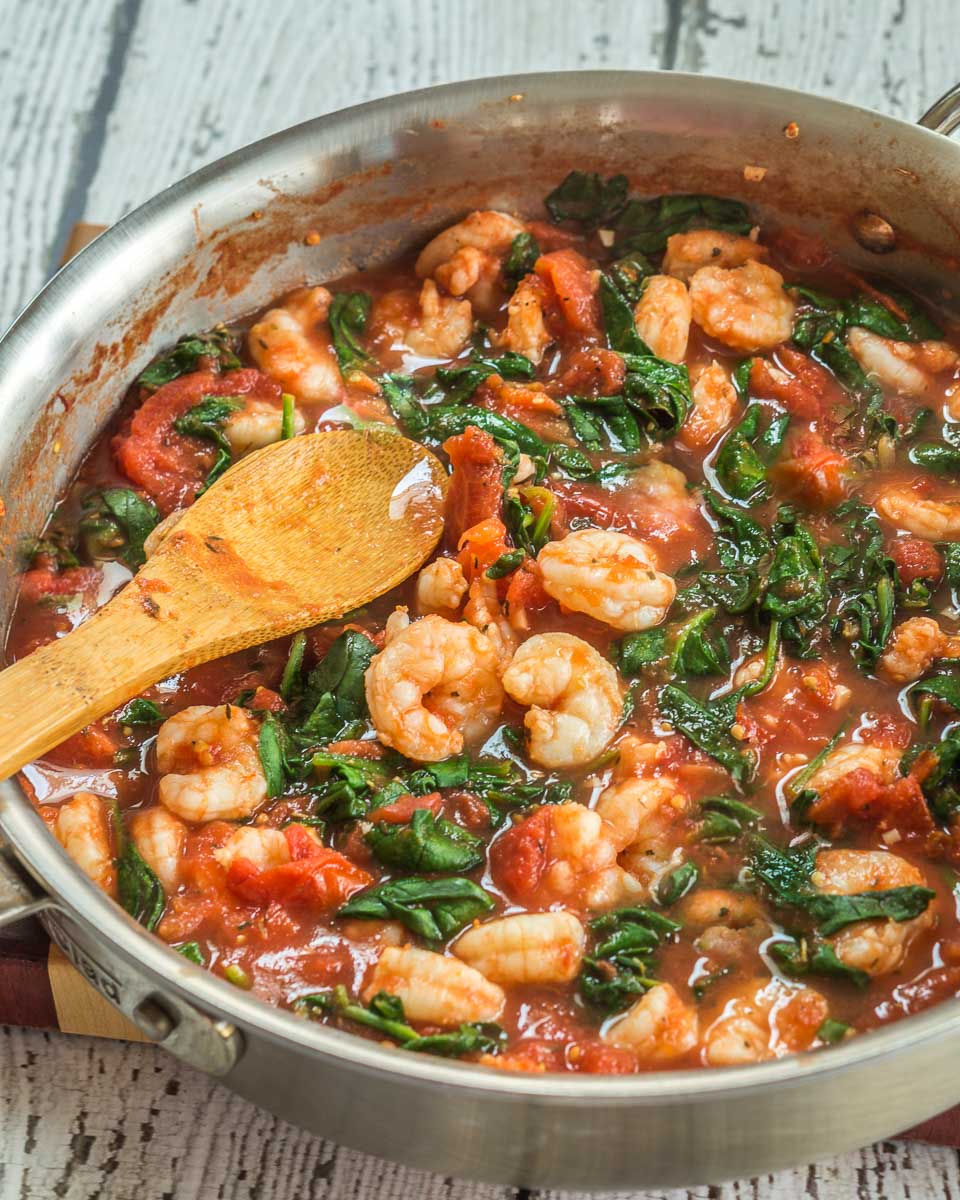 I love my shrimps as evident by the number of posts I have. I frequently buy the “no-salt” tomatoes especially when there are other seasonings such as Italian. I need to use whole wheat pasta more – normally I cook the half and half mixture but with a tomato sauce it masks the nutty flavor of the pasta. Spinach is a good addition – I’m not into greens a lot but spinach, most definitely.