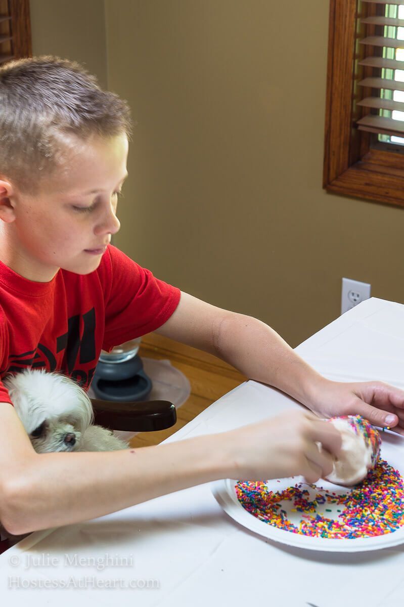 - I covered my table with a disposable vinyl tablecloth and taped down the edges. Sprinkles can stain wood, and they like to go everywhere! It also makes clean-up a breeze;