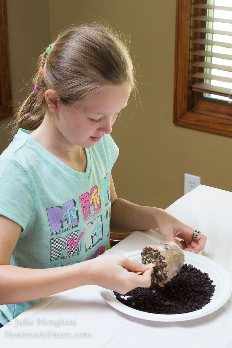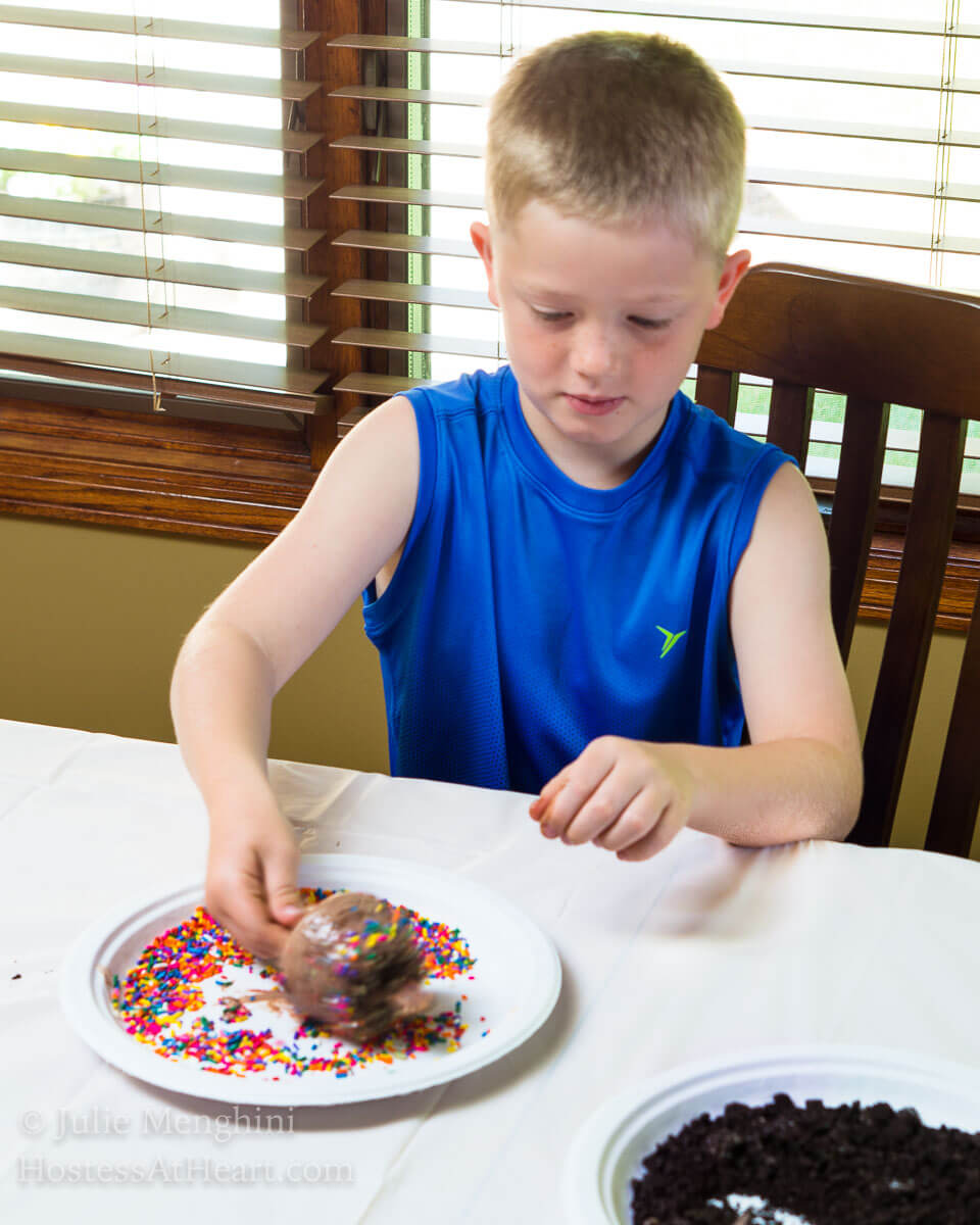 We warmed the cups briefly in our hands until they would just turn. After rolling them in the goodies we put them back in the freezer. In no time, we had some creamy delicious ice cream pops!