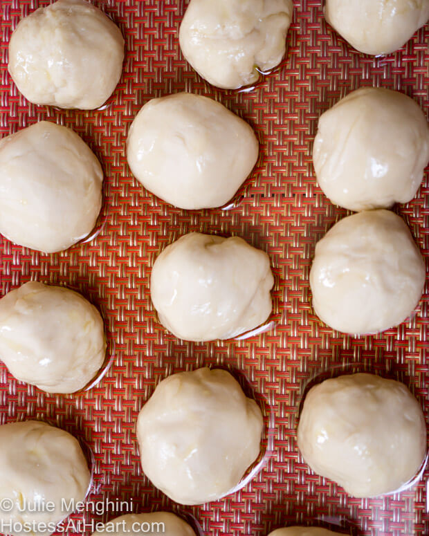 Form the dough into small golf-ball-sized rolls. Place on a baking sheet that is very well greased with ghee or olive oil and pour some more (oil or ghee) over dough. Cover and let rest at room temperature for a least 2 hours or over night.
