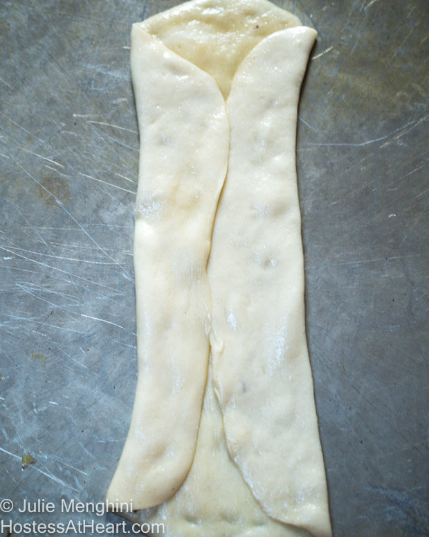 Stretch each ball of dough into a very thin circle (I did this on a pizza pan). Fold the left and right sides to the middle until they meet in the center and form a rectangle.