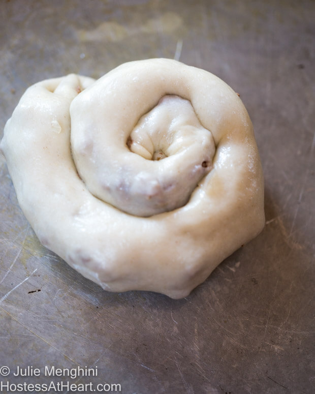 Spread a small amount of filling along the seam. Roll the dough tightly over the meat filling, forming a rope. Turn the rope into a swirl and put on a well greased (ghee or olive oil) baking sheet or pie pan. Continue making the rest of your Sfeeha using ghee to keep it nice and moist.